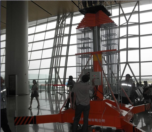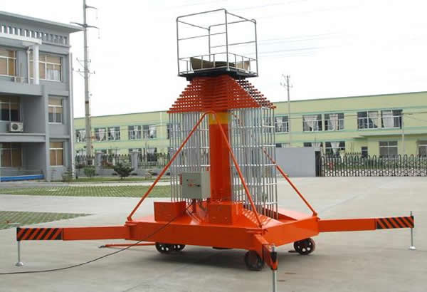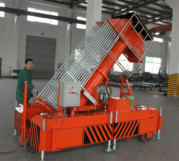 套缸式升降平臺具有設計新穎,體積小,外型美觀,操作維修方便,升降平穩等優點。整機由平臺、伸縮油缸、單梯式或雙梯式防轉機構、底盤油箱、支腿、行走輪等組成。平臺由伸縮油缸直接頂升,當啟動電機時,由電機帶動齒輪泵供油,油液經單向閥及電磁通道輸入油缸,伸縮油缸則逐節上升,當平臺升到最大高度時,系統壓力也就達到了額定工作壓力。